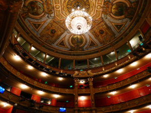 Exkurs (Wiki): „Die Koninklijke Opera van Gent wurde 1840 nach Plänen von Louis Roelandt errichtet. Das Haus verfügt neben dem Großen Saal über drei weitere Räume, die für Konferenzen und Bankette genutzt werden können: das Foyer, die Redoute und den nach Jean-Baptiste Lully benannten Saal. Seine monumentale französische Architektur führt zum großen Saal, in dem Opern und Ballette inszeniert werden und Konzerte und Kongresse stattfinden. Das Haus hat eine längliche L-Form und wurde von den renommiertesten Pariser Ausstattern der Zeit, Humanité-René Philastre und Charles-Antoine Cambon dekoriert. Die ursprüngliche Kapazität des Raumes von 1800 Plätzen wurde bei den Renovierungen zuletzt auf 965 mit erheblich besserer Sicht reduziert. Der Kronleuchter misst 3 × 4,5 m und verfügt über 84 Lampen. Die Kuppel ist in Trompe-l’œil-Manier bemalt.“