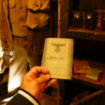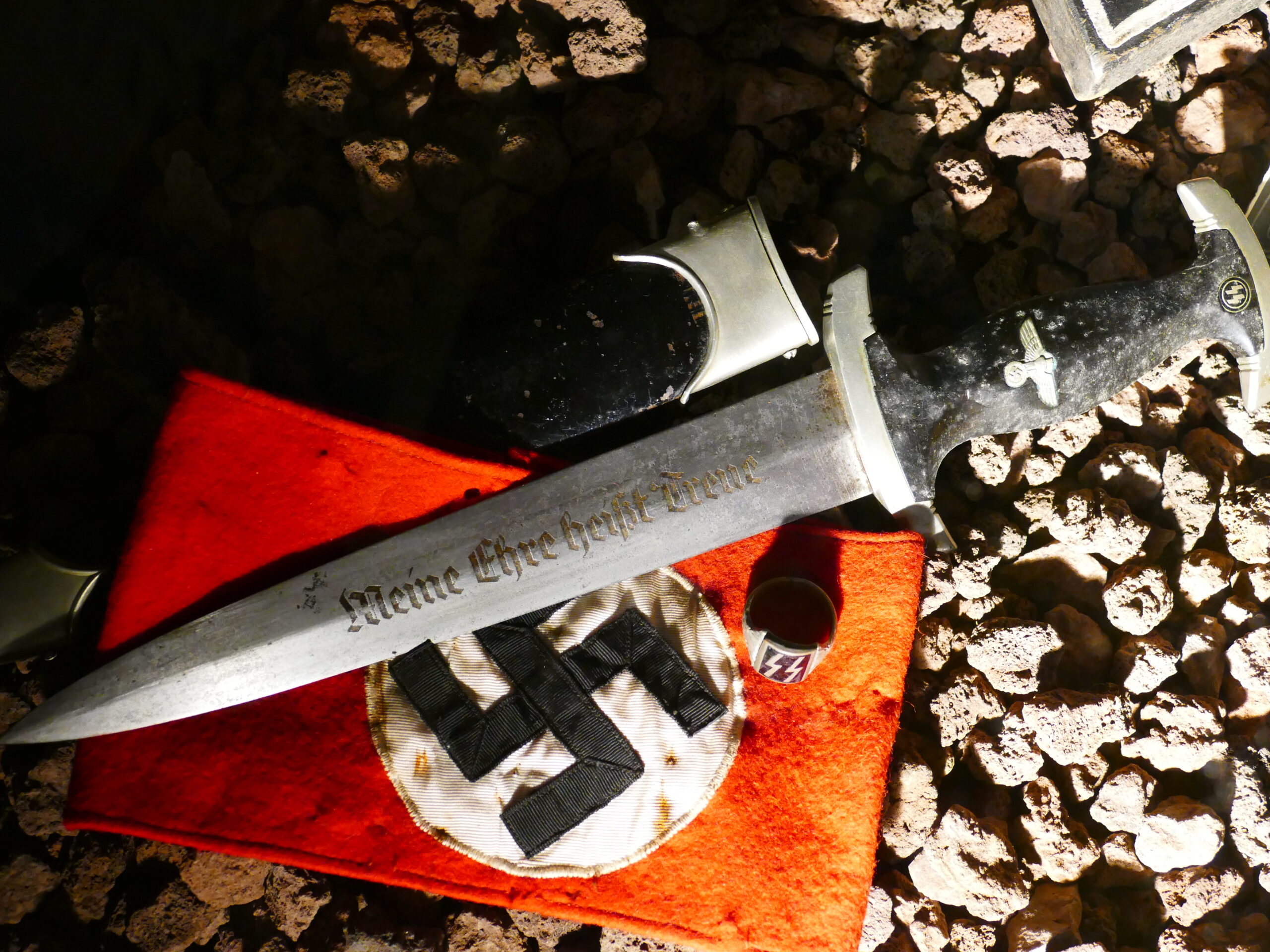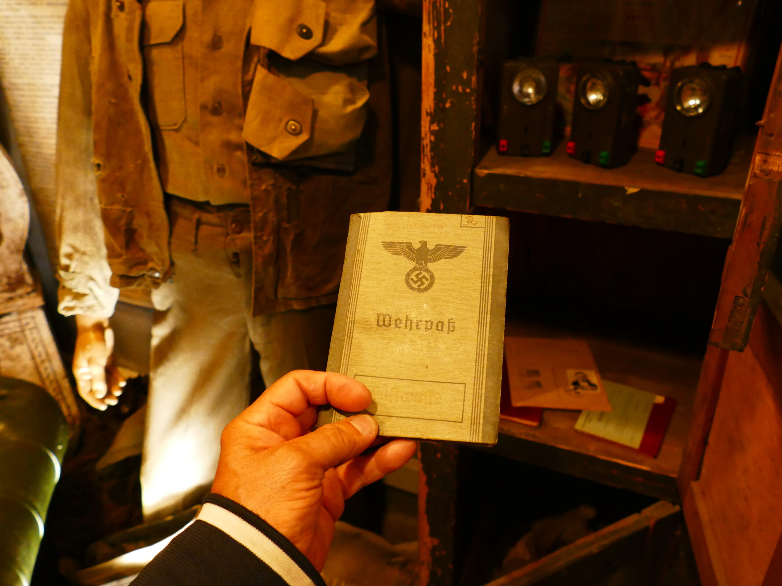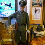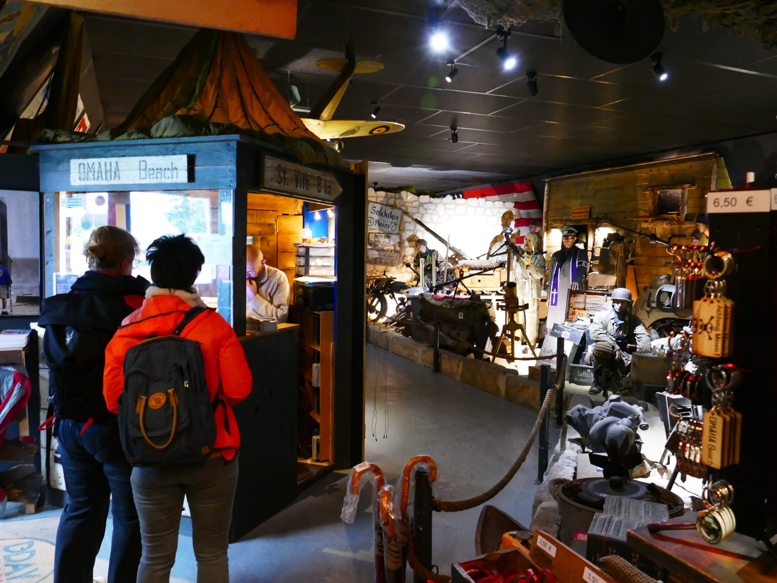 Also erst gegen Mittag zu Fuß zum D-Day Omaha Museum, nicht weit, so 10 Minuten. Anlage nicht sehr groß, alles ziemlich improvisiert, aber hinter einer Nebentür, bei der man nach Entrichten des Eintrittsgeldes klopfen muss, ist ein Raum, der sich nur schwer beschreiben lässt. Bar, zahlreiche Sofas, aber auch Einzelstücke aus WW II. Ebenso persönliche Gegenstände, z.B. ein Originalwehrpass, Ausweis der Arbeitsfront, etc.