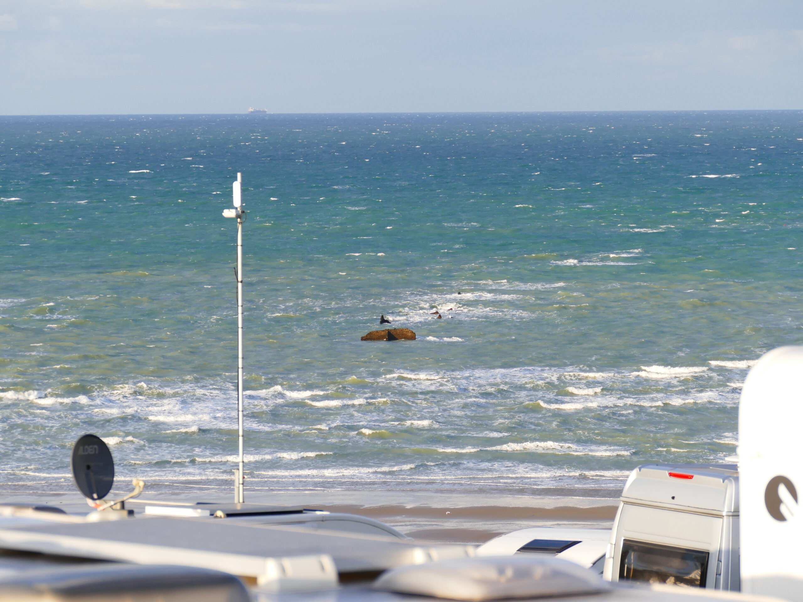 Recht spät erreichen wir Camping Omaha Beach. R organisiert einen Platz mit Blick aufs Meer, beim Aufbau stürmisch und der Platz matschig. Der Teppich hilft, muss aber beschwert werden, damit er nicht wegfliegt.