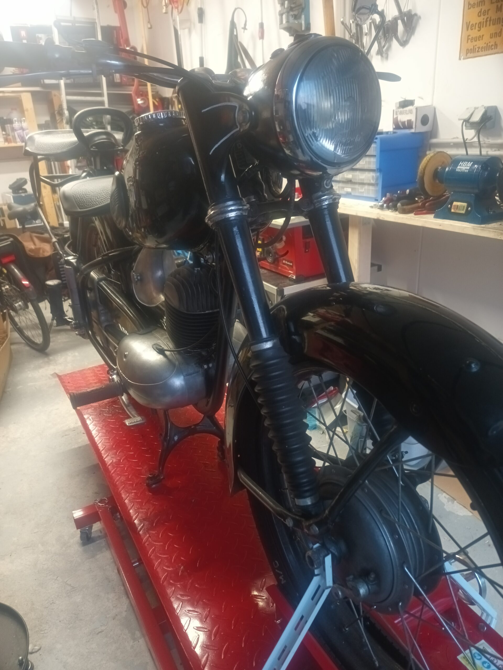 Als erstes mussten ja ersteinmal die Voraussetzungen für eine Restaurierung geschaffen werden. Aus vorherigen Aktionen und der Anmahnung durch das Lebensalter des Schraubers, war der Wunsch nach ein wenig Komfort deutlich. Als Ort standen zwei Möglichkeiten, hier Garagen zur Verfügung. Das Privileg der kurzen Wege, Garage 1: vom Flur direkter Zugang, so 5m, angeschlossen an Zentralheizung. Garage 2: Vom Wohnzimmer über Terasse, so 10 m, keine Heizung, aber Platz. Denn Garage 1 beherbergt den R59 Mini und im Winter die Kawaskai W650, da Garage 2 schon mal durch den Taupunkt geht. Die Entscheidung, da es zum Start ja noch einigermaßen mild war, fiel für Garage 2.
