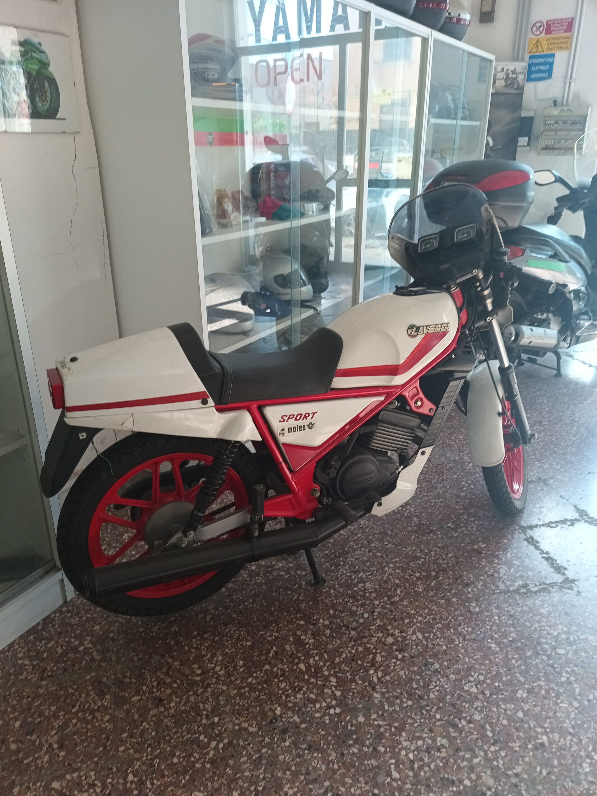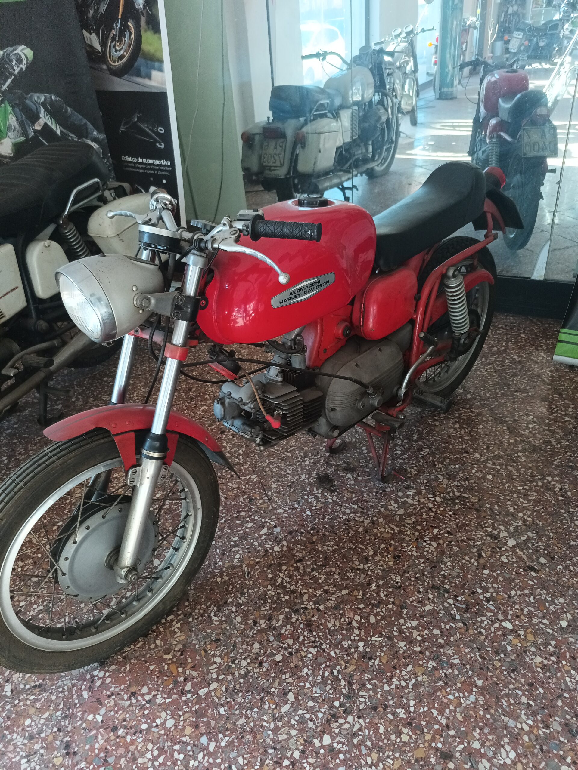 Auf dem Rückweg, vorbei an einem verwilderten Garten mit seltsamen Bäumen, stehen einige historische Motorräder im Schaufenster. Ich darf Sie fotografieren und in Englisch / Italienischgemisch wird auch noch der zu ersetzende Zylinderkopf eines Renault „Sahneschnittchens“ gezeigt (Korrisionsschaden, vielleicht sollte man gelegentlich doch die Kühlflüssigkeit wechseln?).