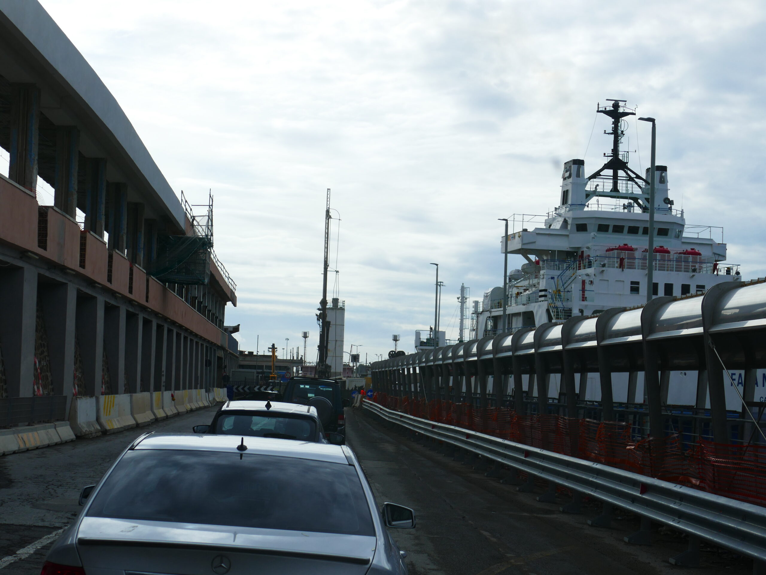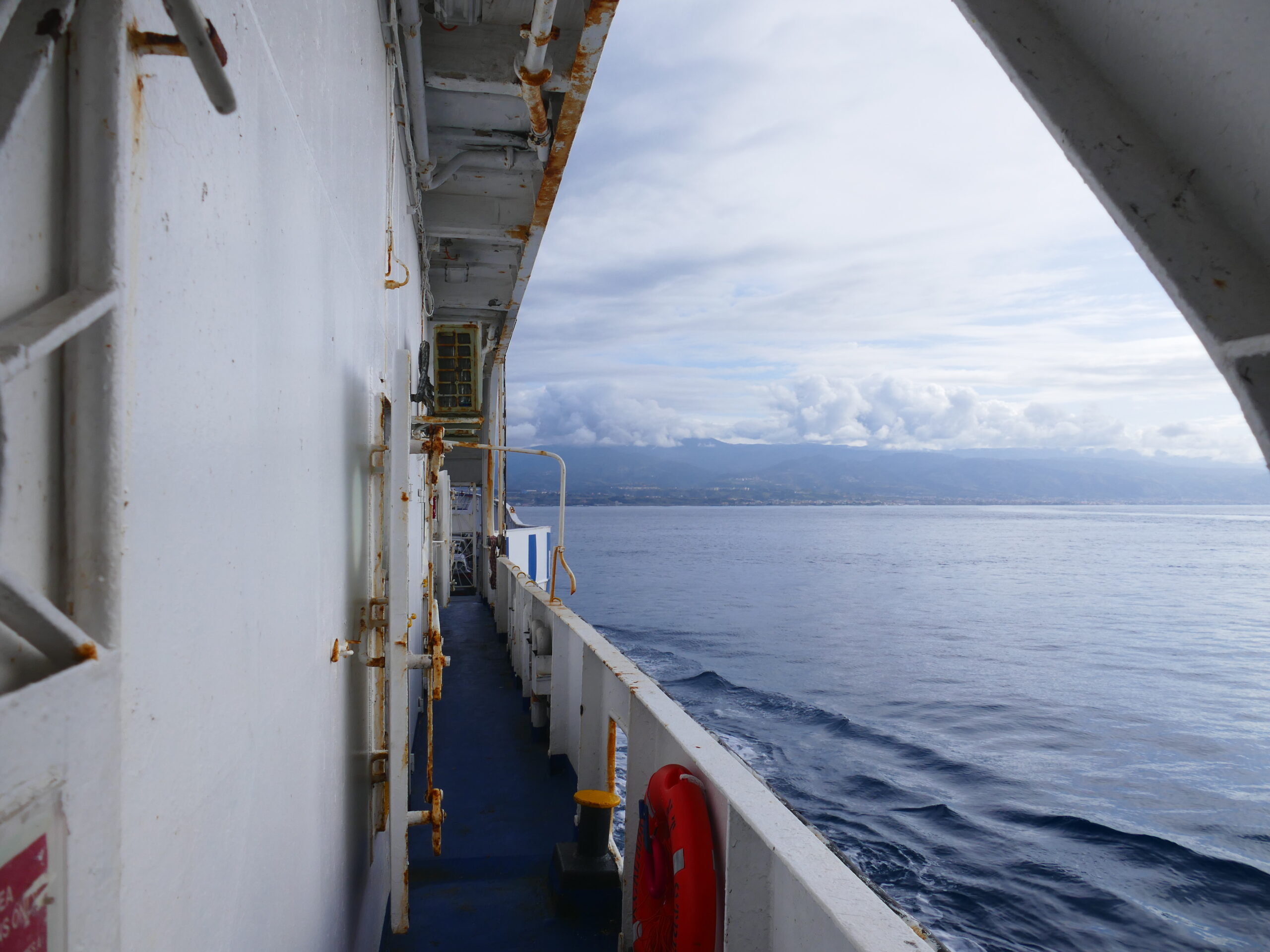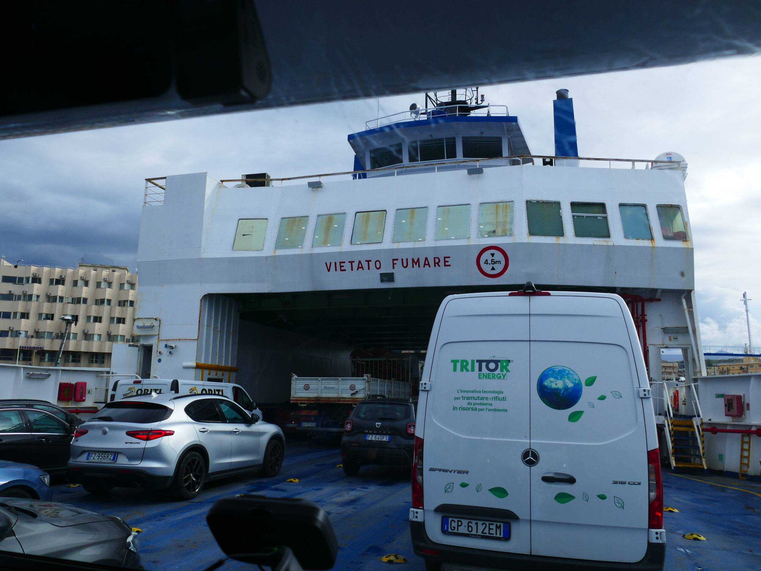 Wir erreichen Messina gegen 11:00 h, Ticket für die Fähre gibt es sofort, wir stehen kaum 10 min in der Warteschlange und sind dann schon auf der Fähre. R hat noch schnell Brote gemacht, gut so, da die Fahrzeuge verlassen werden müssen. Die Überfahrt ist auch schnell erledigt, wohl so 30 min. Um 13:30 h wohlverdiente Pause mit sehr spätem Frühstück.