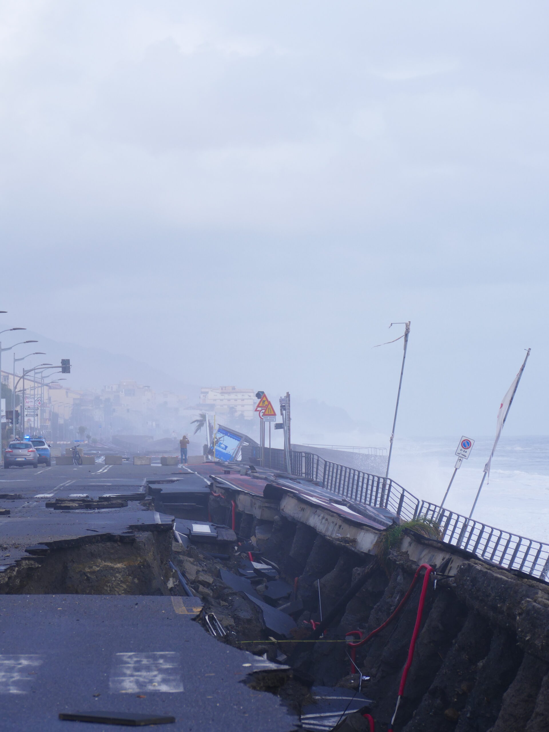 Zunächst sieht es so aus, dass wir vor dem Tor wohl autark stehenbleiben würden, wir telefonieren herum, schließlich erfahren wir, das direkt nebenan Triscell Area Attrezzata Camper geöffnet hat. Erst ist am Tor niemand, dann werden wir aber eingewiesen, noch zwei andere WoMos und ein Wohnwagen sind da. Im Regen nivellieren wir, Strom ist auch da. Beim Conad haben wir zwei Mahlzeiten eingekauft, Abendessen im schaukelnden WoMo, der Sturm ist da.