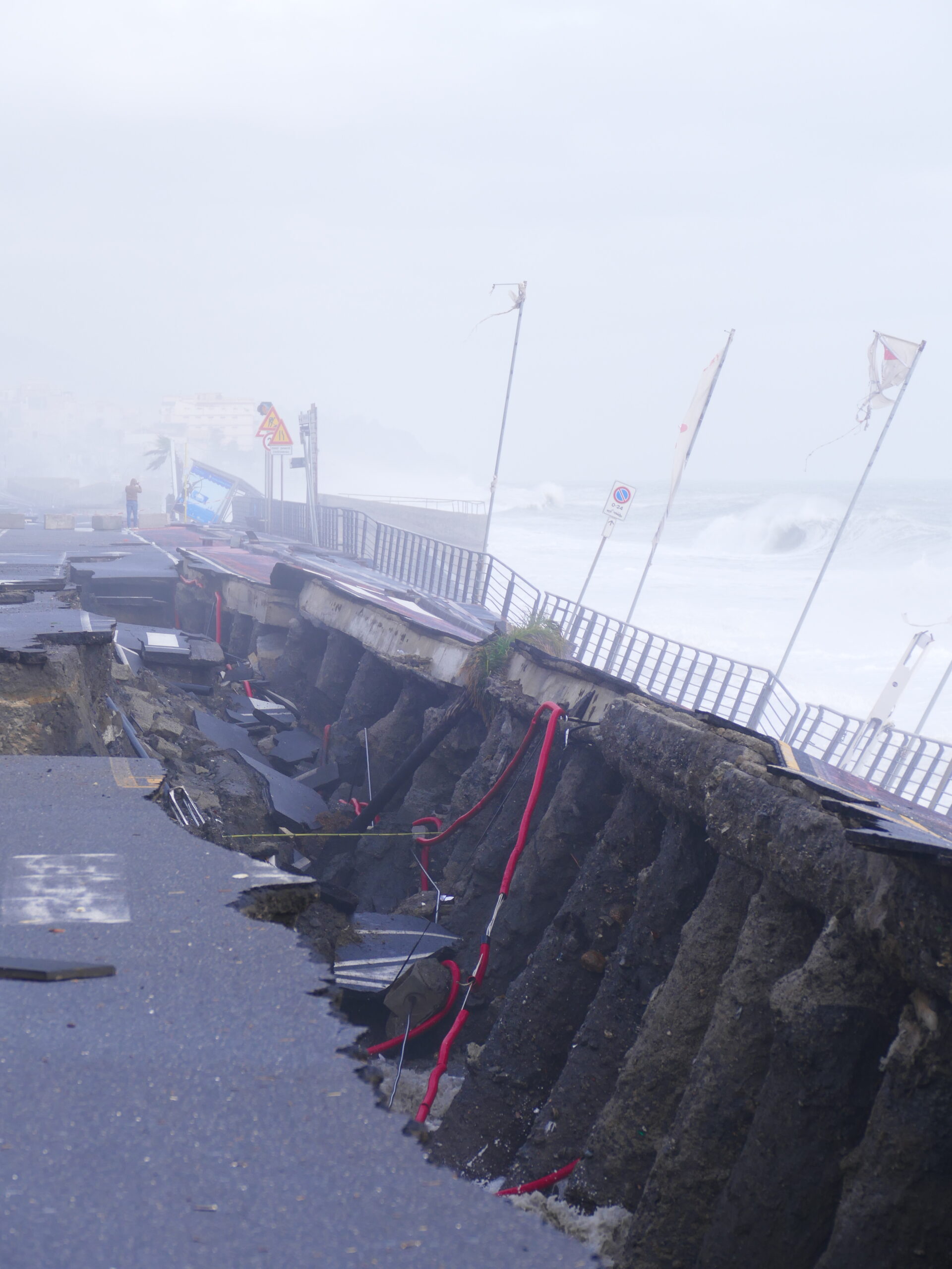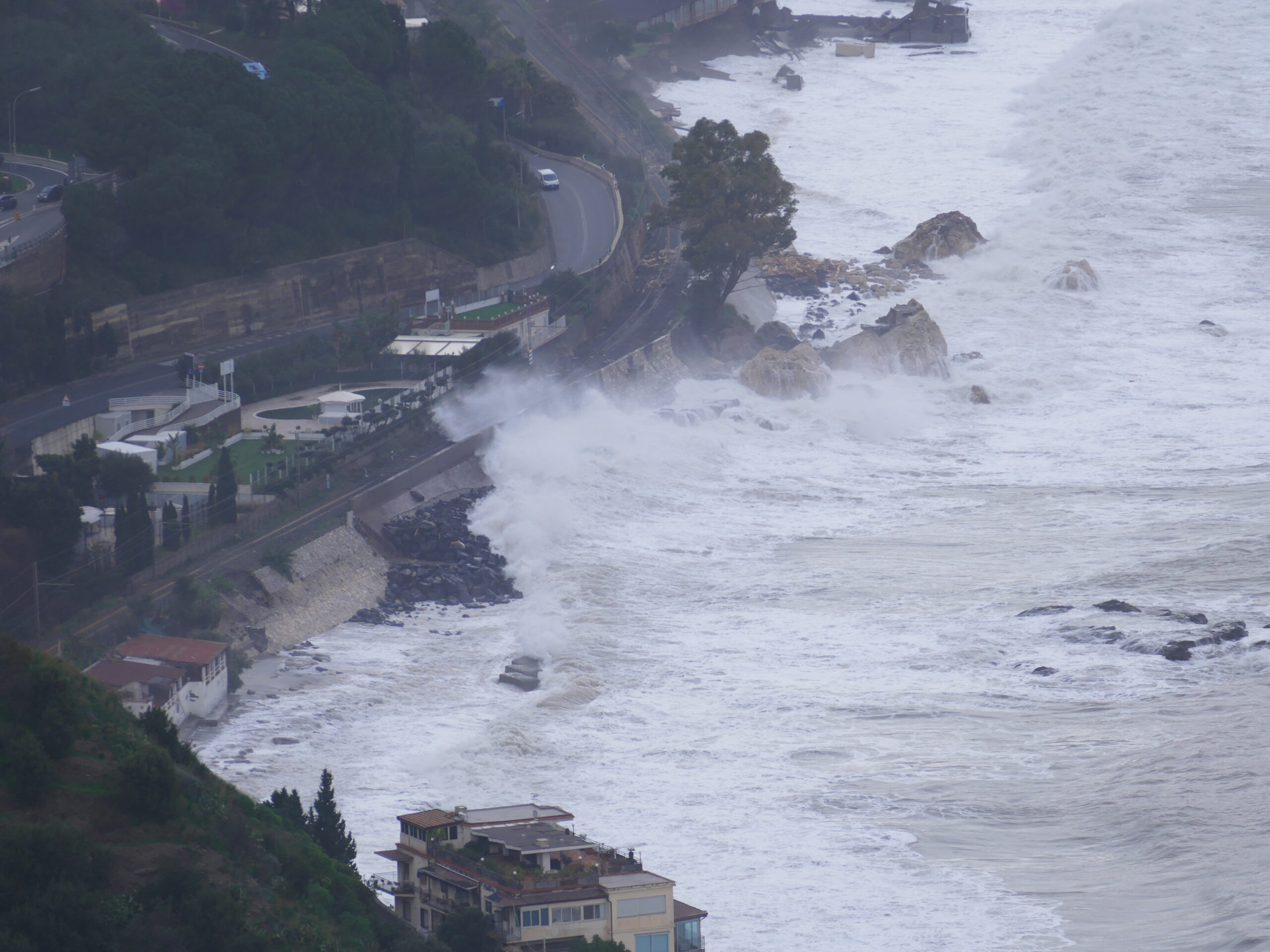 Regenradar weist die 100 km/h für den Sturm erst für den folgenden Tag aus, daher entscheiden wir neu und beschließen noch bis Taormina zu fahren. Unterwegs gibt es schon starken Seitenwind, aber auf der Autobahn A18 geht es ganz gut voran. In Sant‘ Alessio Sicula, schon hinter Taormina, ist der Campingplatz Focetta Sicula wegen des Sturmes geschlossen. Ist nachvollziehbar, da er direkt am Strand liegt.