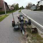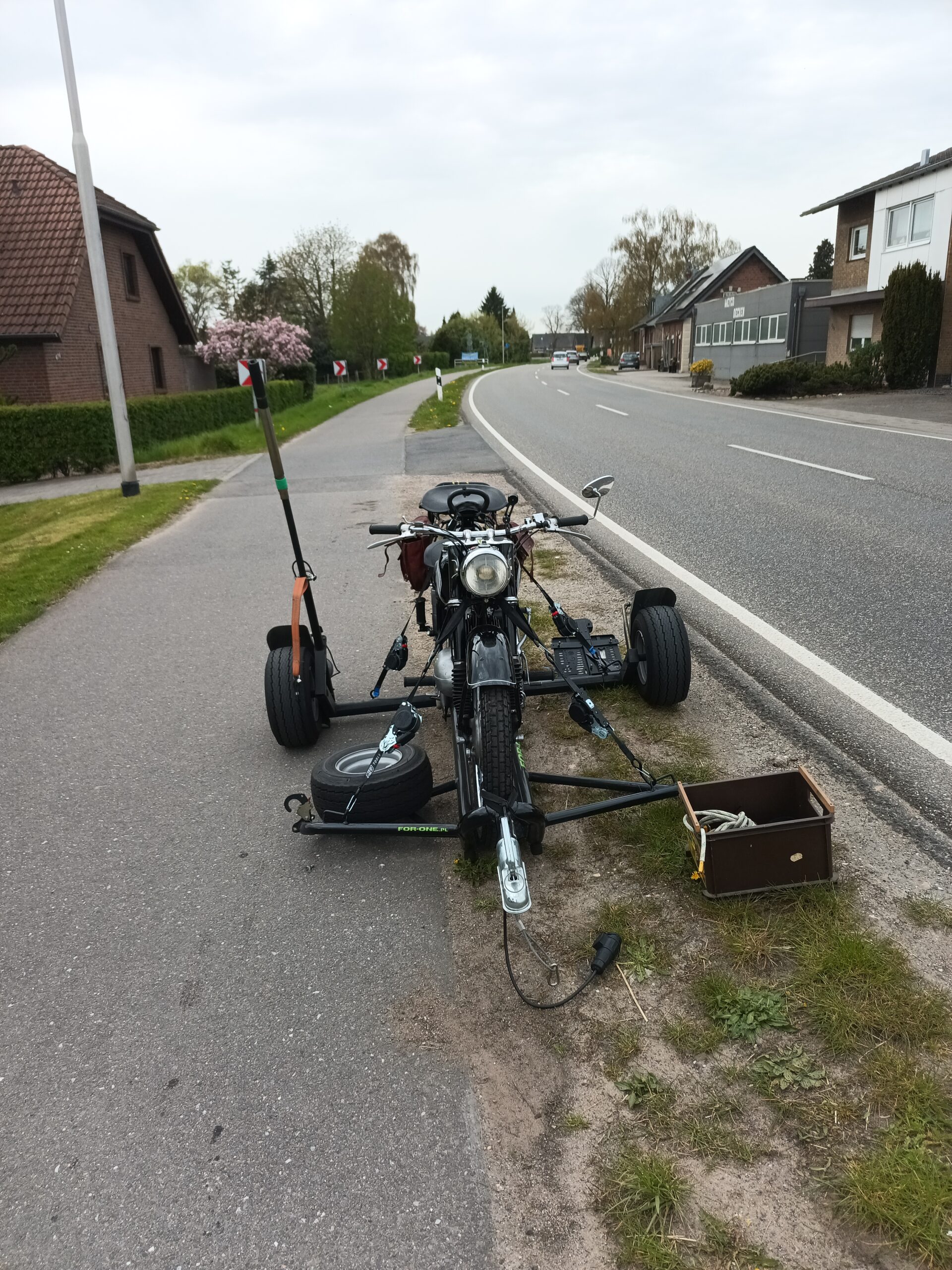 Bitte um Hilfe bei Renate, werde abgeholt. Hänger aus der Garage bugsiert und mit dem Ford zur „Unfallstelle“. Beim Aufladen überfordert, da kein Seitenständer. Hilfreiche Hände, nachdem drei Kinder probegesessen haben, halten die DKW, derweil ich verzurre.