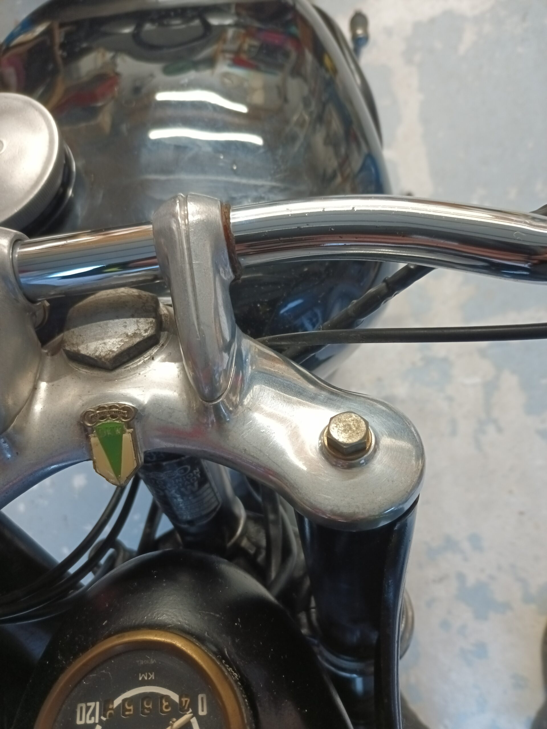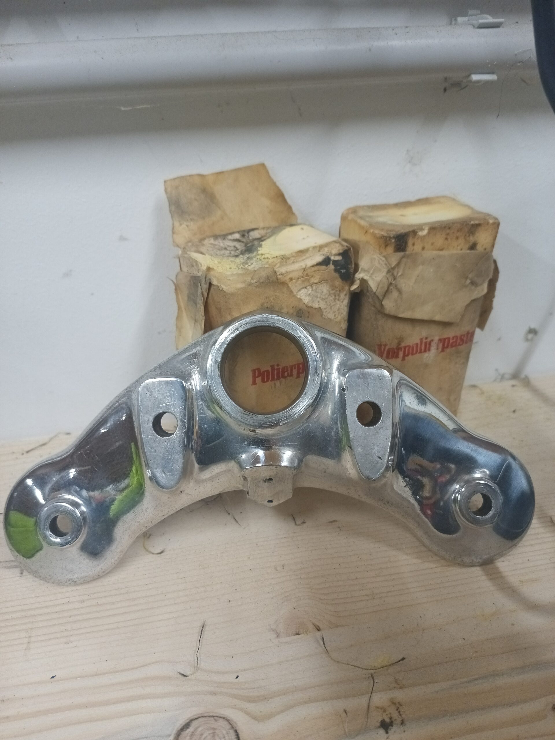 Einige Lackbestellungen und Baumarktbeschaffungen, Zierstreifen, sowie die Poliermaschine und Polierpads fehlen in der Aufzählung. Weiter geht es dann mit den Arbeiten im nächsten Beitrag, hier als Teaser und weil es eine einfache schöne Arbeit war die Brücke der Lenkerbefestigung vorher (re anpoliert) und nachher:
