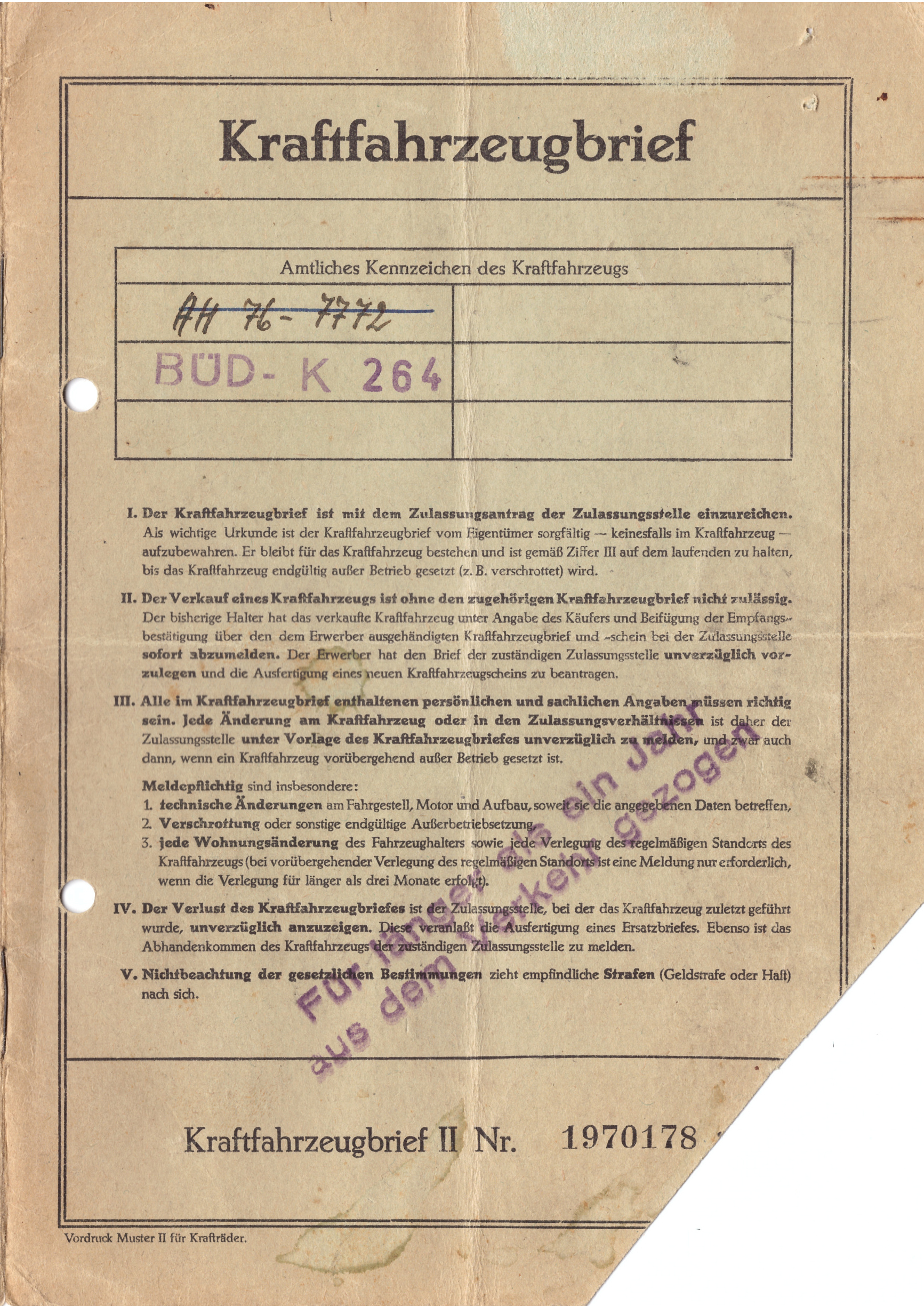 Da der alte Brief, die „graue Pappe“, noch zu den Unterlagen gehörte, kann die Historie der Vorbesitzer lückenlos nachvollzogen werden. Der alte Brief hat die Nummer 1970178, daraus ist jedoch nicht zu schließen, es hätte nur etwa 2 Mio Fahrzeuge in Deutschland gegeben. Die zwar fortlaufende Nummer wurde im im Zulassungsbezirk, n AH 76-7772 vergeben. Übrigens nicht Ahaus. Mit mir sind es jetzt 6 Besitzer und für jeden von uns hat diese DKW sicher eine ganz eigene Bedeutung. Weiterlesen